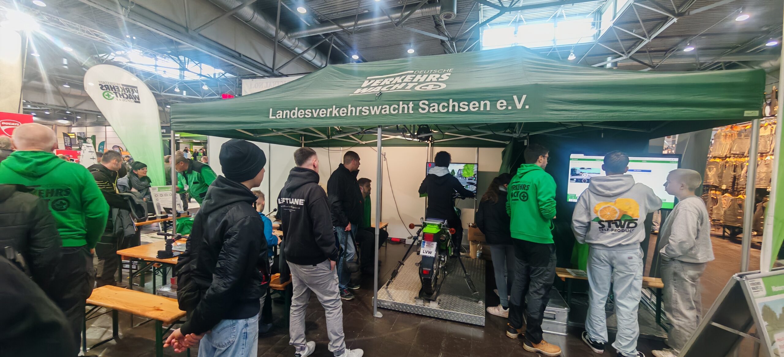 Motorradmesse Leipzig 2026 – Sicherheit erleben, Saisonstart vorbereiten 09.02.2026 Der Countdown zum Saisonauftakt lief: Vom 6. bis 8. Februar 2026 verwandelte sich die Motorradmesse in Leipzig erneut in den Treffpunkt der Zweiradwelt. Rund 59.000 Besucherinnen und Besucher nutzten die drei Messetage, um sich kurz vor dem traditionellen Saisonstart über aktuelle Trends, neue Modelle und innovative Technik zu informieren. Auch die Landesverkehrswacht Sachsen e.V. war vor Ort vertreten und setzte auf Begegnungen und Beratung rund um das Thema Verkehrssicherheit. Im persönlichen Austausch konnten Interessierte Fragen zu allen sicherheitsrelevanten Aspekten stellen und mit unseren Simulatoren verschiedenste Verkehrssituationen realitätsnah und vollkommen risikofrei erleben. Besonderes Interesse weckten der Motorradsimulator, der typische Szenarien aus dem Straßenverkehr zeigte und für mögliche Gefahren sensibilisierte, sowie der Brems- und Ablenkungssimulator, der Führerscheintest und der Rauschbrillenparcours. Ob als Tester oder Zuschauer – Verkehrssicherheit wurde für alle erlebbar gemacht. Unser Dank gilt dem Sächsischen Staatsministerium für Infrastruktur und Landesentwicklung, die unseren Messeauftritt ermöglicht haben. Wir wünschen allen Zweiradbegeisterten einen sicheren Start in die neue Motorradsaison und jederzeit gute Fahrt. Wir freuen uns auf ein Wiedersehen auf der Motorradmesse Leipzig 2027.